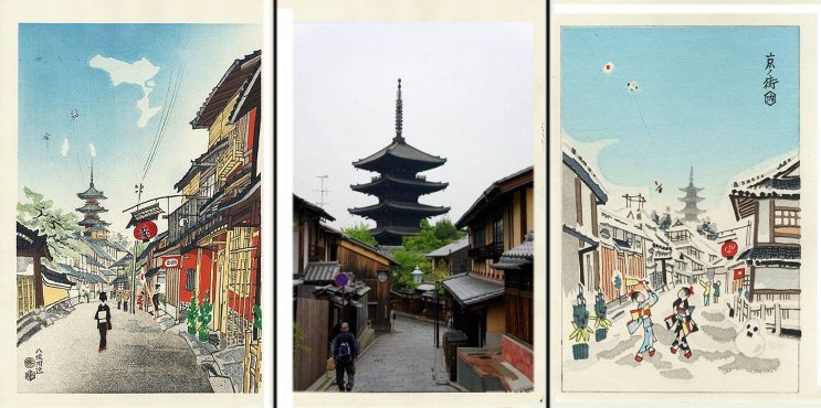 Years's Day street scene near Yasaka Hill in Kyoto is depicted