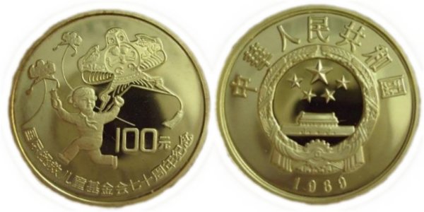 | 100 Yuan (元) 1989 Gold / Gold / 黄金 Anlagemuenze, Gesetzliches Zahlungsmittel, Gedenkmuenze (Maedchen mit grossem BeiJing-Schwalben-Drachen und zwei weiteren BeiJing Schwalben im Hintergrund) 70 Jahre UNESCO Beschriftung: Vorderseite:100 Yuan, UNESCO 70. Jubilaeum Rückseite: PR China, 1989 |