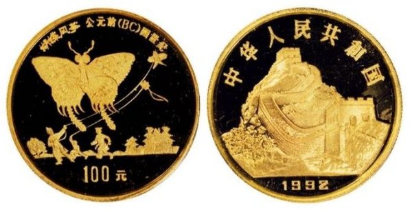 京燕子风筝和双方扁平风筝) 刻字 面值: 100 元,蝴蝶风筝 - 公元前 400 年 背面:中华人民共和国 1992 |