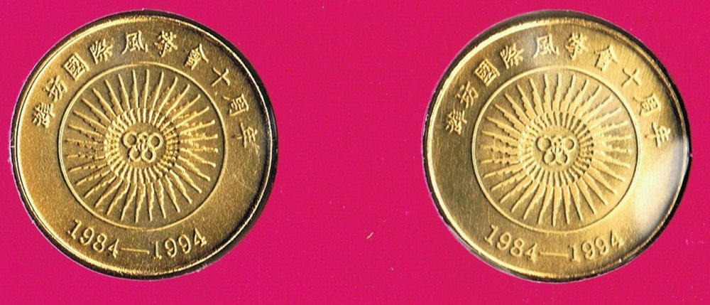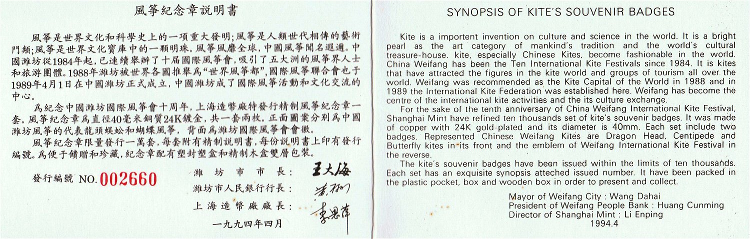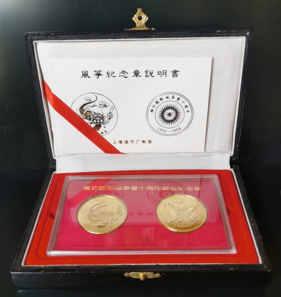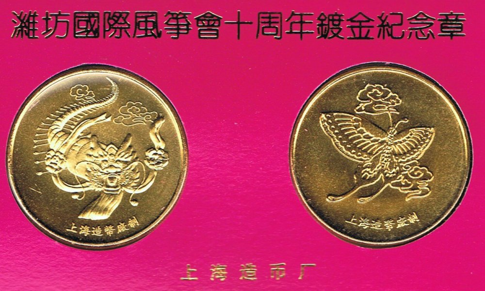 1994 Centipede und Schmetterlings-Drachen Centipede Kite and Butterfly Kite Medallien-Set zum 10-jaehrigen Jubilaeum des Internationalen Drachenfestes (Kupfer/Gold, Muenze Schanghai April 1994) Set of two medals on the occasion of the 10t anniversary of the WeiFang International Kite Festival (Copper, Gold plated, ShangHai Mint April 1994) 潍坊国际风筝会十周年纪念奖牌两枚一套 (铜质镀金,上海造币厂1994年4月) (Offizielle Beschreibung / Leaflet) / 官方说明 Schmuckkassette / Jewel Box / 珠宝盒 ShangHai Mint 1994-04 上海造币厂 |