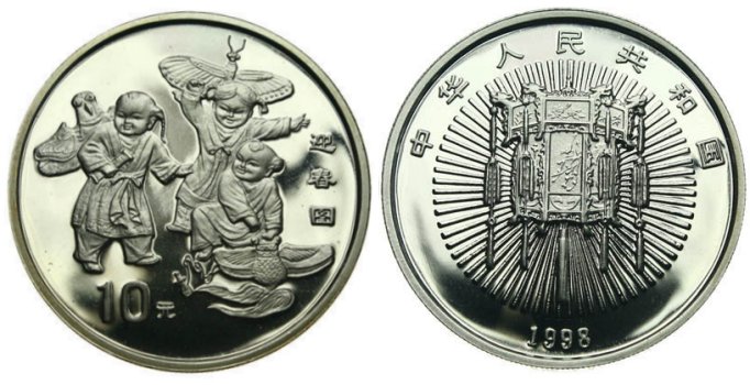 | 10 Yuan 1998 Silber / Silver / 银币 Anlagemuenze, Gesetzliches Zahlungsmittel, Gedenkmuenze (BeiJing-Schwalben Drachen <links>, Insekten-Drachen <Mitte, oben> und Goldfisch-Drachen <rechts unten>) Bullion Coin, Non Circulating Tender Coin (NCLT), Commemorative Coin (BeiJing-Swallow kite <left>, Insect kite <center, above>, and Goldfish kite <right, bottom> 银币 、 非流通投标币 (NCLT)、纪念币 (北 京-燕子风筝<左>、昆虫风筝<中、上>、金鱼风筝<右、下> |