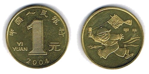 | 1元2004年 (农历新年四枚(非)流通招标硬币(NCLT)),纪念币 (拿着典型的手动绕线器和横梁方形风筝的 男孩) 刻字: 面值:1 元/一元,中国,2004 年 背面:“甲申”(猴年上升木或 第十天干 / 第九地支) |