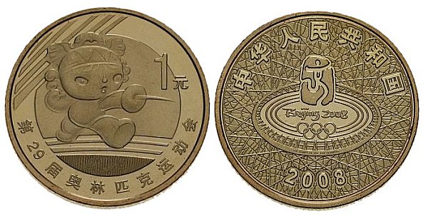 1 Yuan 2008 Kursmuenze, Gedenkmuenze Olympia Mascottchen Nini beim Fechten (Mascottchen Nini mit Peking-Schwalbe im Haar) Beschriftung: Vorderseite:1 Yuan, 29t. Sitzung der Olymischen Versammlung Rückseite: PR China 2008, Beijing 2008 1 Yuan 2008 (Non) Circulating Tender Coins (NCLT), Commemorative Coin Olympic Mascot Nini Fencing (Mascot Nini with BeiJing Swallow on top of its head) Lettering Face: 1 Yuan, 29th Session of the Olympic Committee Back: PR China 2008, Beijing 2008 |