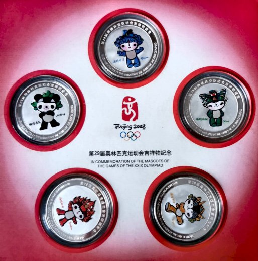 Olympia 2008 Nini mit BeiJing-Schwalbe auf dem Kopf Olymic Mascot Nini with traditional Swallow Kite on head 头上戴着 传统燕子 风筝的奥运吉祥物尼尼 aus einem Set von 5 Medaillen from a set of five medals 从一套五枚奖牌中 |