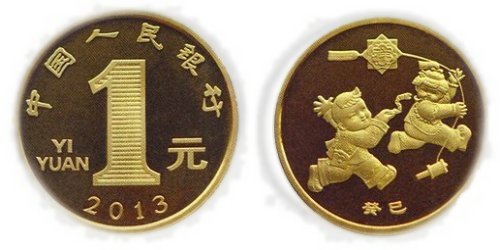 1 Yuan 2013 Kursmuenze, Gedenkmuenze (Muenze zum Neujahrsfest) (Junge mit typischer Drachenspule und Kreuzstab-Quadrat Flachdrachen) Beschriftung: Vorderseite:1 Yuan, PR China 2013 Rückseite: "GuiSi" (Jahr der Schlange im Aszendenten des Wasser oder 10.Himmelsstamm / 6. Erdenkreis) 1 Yuan 2013 (Non) Circulating Tender Coin (NCLT) for Lunar New Year), Commemorative Coin (Boy with typical handreel and cross-spar square kite) Lettering: Face: 1 Yuan, PR China Back: "GuiSi" (Year of the Snake in the ascendant of Wateror 10th Heavenly Stem / 6th Earthly Branch) |