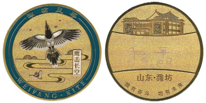 Drachen Museum 2025 Der Adler Kreist am Himmel (Zitat von MAO ZeDong) Kupfer, Gold-plattiert, 30g, Durchmesser 45mm WeiFang Kite Museum 2025 The Eagle Soars the Sky (Citation by MAO ZeDong) Copper, Gold-plated 30g, 45mm Diameter 潍坊风筝博物 馆2025 鹰击长空 (毛 泽东 铜) 镀金 30 克,直径 45 毫米 |