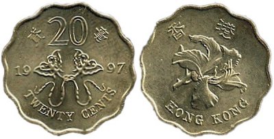 | 20 Cent 1997 Kursmuenze, (zwei Schmetterlingsdrachen, mit einander durch Drachenleine verbunden Circulating Tender Coin (two Butterfly kites, attached to each other with its kitelines 流通的投标硬币 两只蝴蝶风筝,用 风筝线连在一起 HongKong 1997 香港 |
