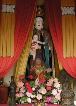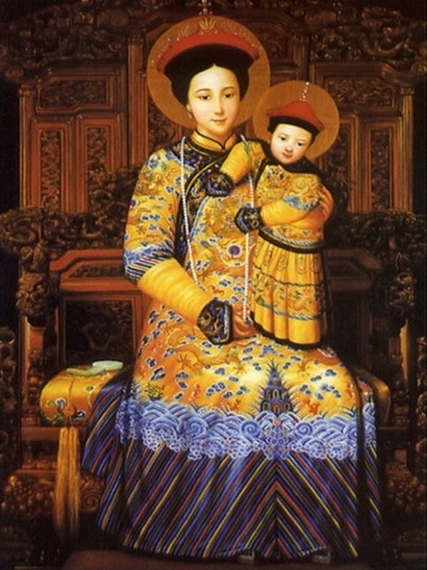 The concept of showing a Celestial Being as a 'Mother with Infant', demonstrating compassion, and miraculous powers, also considering a symbol of grace and a patron saint of women and children, seems to be quite universial.(cp. Raphaels 'Sistine Mother Mary' from 1512, or 'Our Lady of China' from 1997 in the North Cathedral of BeiJing), which has even made it onto a postage stamp in 2022. |
