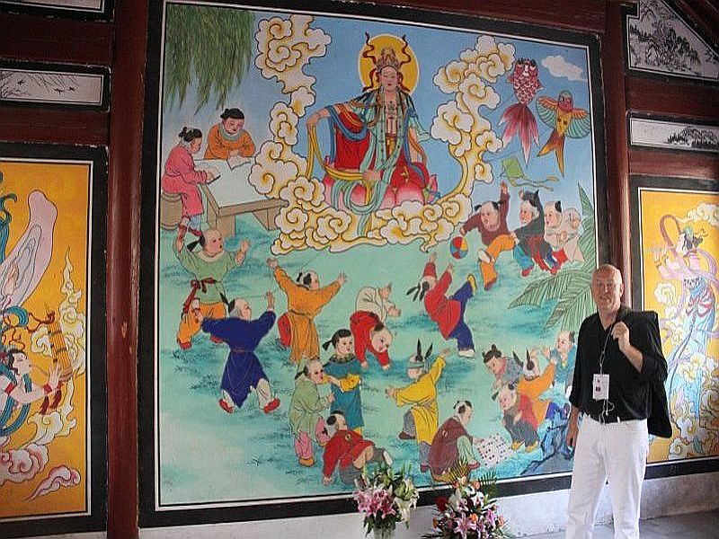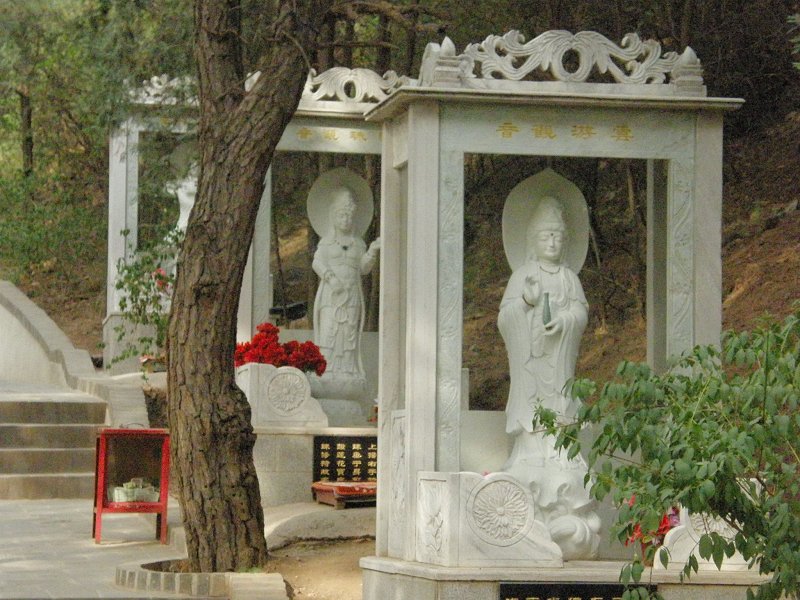 Buddhahood. Buddhists believe that when someone leaves this world, GuanYin puts them in the heart of a lotus and then sends them to the 'Western Pure Land' (Sukhāvatī). The lotus flower is a symbol of purity. GuanYin is therefore often shown floating on lotus flowers. The corresponding sutra is the lotus sutra. There are sung interpretations of all performers from art and music famous in Asia, such as Andy LAU, Imee OOI, but also Tina TURNER). A sutra is an often recited or sung Buddhist text (mantra as a chant). Lotus flowers are often depicted on traditional Chinese captivating dragons, and are a direct allusion to those with the concept of 'spiritual purity' as religious content. Representations of Buddha in his manifestation as 'GuanYin' are often carried out in a feminized form. In popular belief, GuanYin is therefore also perceived as a female being. With her mild acting and miraculous powers, she is considered a symbol of grace and a patron saint of women and children. It is therefore not surprising that GuanYin is also portrayed with children playing who fly kites. The HongLuoSi Temple in BeiJing, is mainly dedicated to GuanYin. The temple is a bit outside of the city, in a beautiful mountain park. On the way to the summit you can walk through a smaller temple building, where you may find a large wall painting. GuanYin is here to be seen with lots of children, some of them flying kites.The way down from the mountain is lined with many small GuanYin shrines.The way down from the mountain is lined with many small GuanYin shrines. |
