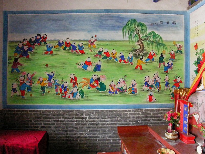 ('Goddess' of Mercy) with children playing (Goldfish kite, bird kite, Malay kite) HongLuoSi Temple. BeiJing 2010 |