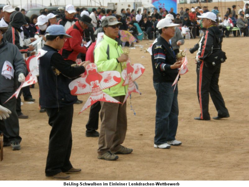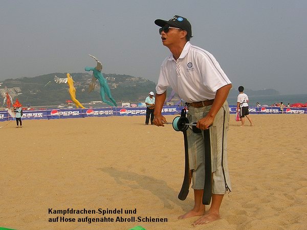 rotating coil. The winding speeds are unbelievable. During this years International Kite Festivals in Weifang, and Yinchuan, the participants from Hong Kong were the most successful ones. A comment from a unsuspecting, visibly shocked and stunned Sino-American participant, whose fighter kite had been successfully cut: "... they slaughtered everyone, they really slaughtered everyone ...". |
