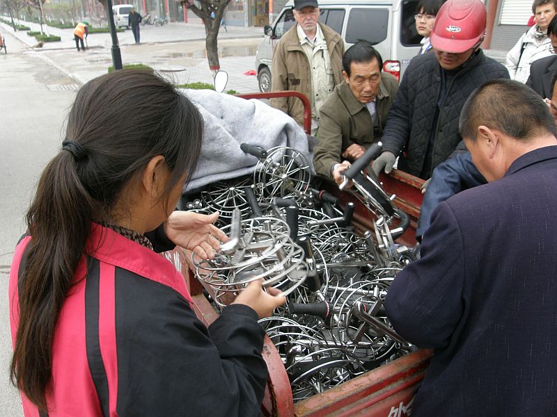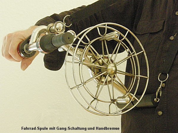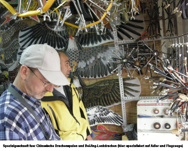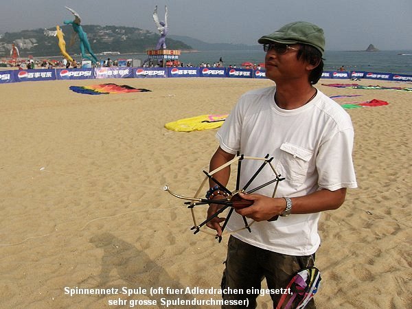 | Special Reels Kiting people are definitely concerned about exclusivity. Apart from the completely molded Bronze Reel (only because of the golden colour tone!), the reel has subsequently a full-blown coil with supra-and sub-setting and of course first class ball bearings. For the divinely gifted technology enthusiast, there is of course the bike-reel coil with multi-gear and integrated hand brake. The pictured specimen is from the kite builders village YangJiaBu , and was sold for the equivalent of 20 € by a street vendor. Comparing Chinese standards, an expensive pleasure, but you deserve it! ![]() |