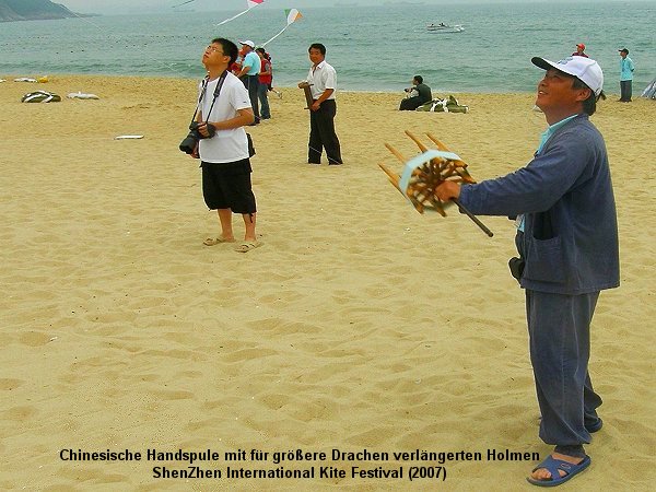 | Chinese Hand Reels are operated using your index or your thumb. You will find technical explanations and hints at "(3) Werkzeuge zum Aufwickeln der Drachenleine" ("tools for winding up the kite line") in the section about Flying of Chinese Kites. |