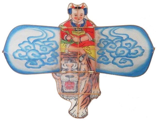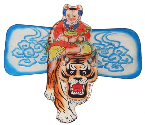 骑虎童子 (QiHuTongZi) Das Tiger reitende Kind Child, riding a Tiger 46 cm x 37 cm Der Tiger ist das Symbol fuer Tapferkeit und Staerke. Er ist im Chinesischen Tierkreisszeichen das 3. Himmels-Symbol. In der Hand haelt das Kind ein RuYi-Szepter, ein gluecksverheissendes Symbol, das auch fuer Staerke und Macht stehen kann. Das Kind traegt zwei rote Hoernchen auf dem Kopf. Ein Hinweis auf magische Faehigkeiten vgl. QiLin). Siehe auch die etwas groesseren Variante ohne Hoernchen. The tiger is a symbol for bravery and strehth. Within the Chinese zodiac, it represents the third house. The child holds a RuYi within its hands. The RuYi is an auspicious symbol of strenth an power. The child is wearing two small red antlers. The antlers are a symbol of magic powers (cf. QiLin). Compare the larger variation! 老 虎是勇敢和坚毅的象征。在中国十二生肖内,它代表第三宫。孩子抱着如 意在其手中。如意是增强实力的吉祥象征。 这个孩子戴着两个红色的小鹿角。鹿角是魔力的象征(参见麒 麟)。 比较较大的变体! weitere Drachen / more kites / 更多风筝 Copyright 2002 ff: Hans P. Boehme |