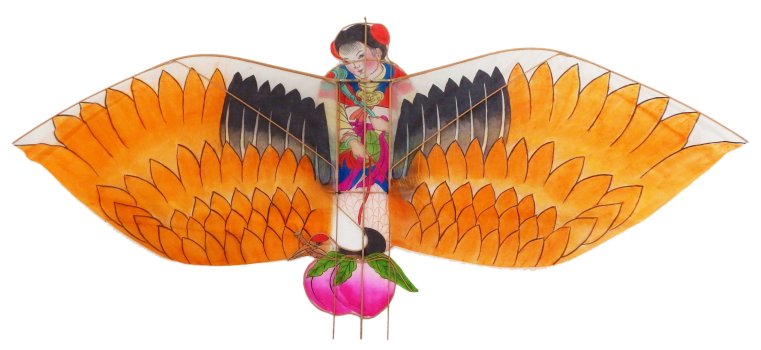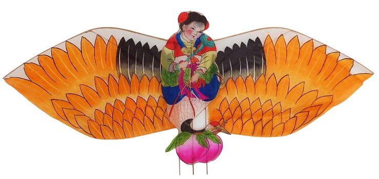 reinforced at the frame. They dominate the whole golden (yellow/orange) color indicates at a royal relationship.The child holds a RuYi within its hands. The RuYi is an auspicious symbol of strength and power. Peaches also symbolise longevity. In Chinese mythology,Peaches are the provisions of all kinds of immortals. Another variation of this topic ("the Crane Riding Child") is to be found within the section of Hardwing-Kites. kite. Thus this kite has to be classified as a genuine Softwing Kite. 骑鹤童子 起重机是长寿,智慧,老年以及父子关系的象征。鹤通常有白色的羽毛。金色(黄色/橙色)表示处于王室关系。孩子手拿如 意。 如意是吉祥的象征力量。桃子还象征着长寿。在中国神话中,桃 子是各种神仙的规定。另一个在硬翅类风筝部分中可以找 到该主题的 变体(骑鹤童子)。 这只风筝的中心部分代表一只真正的硬翅风筝。连动的软翅在框架处得到加固。他们统治整个风筝。 因此,这种风筝必须归类为真正的“软翼风筝”。 90 cm x 36.5 cm |
