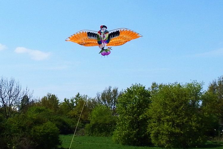 骑鹤童子 (QiHe TongZi) Das den Kranich reitende Kind Der Kranich ist das das Symbol fuer ein langes Leben, Weisheit, Alter sowie die Beziehung zwischen Vater und Sohn. Kraniche haben in der Regel ein weisses Gefieder. Die goldene (gelbe/orange) Farbe dieses Kranichs weisst daher auf einen kaiserlichen Zusammenhang hin. In der Hand haelt das Kind ein RuYi-Szepter, ein gluecksverheissendes Symbol, das auch fuer Staerke und Macht stehen kann. Der Pfirsich (Doppel-Pfirsich) symbolisiert die Langlebigkeit. In der Chinesischen Mythologie gelten Pfirsiche als Speise der Unsterblichen. Eine weitere Variante dieses Themas ("Das Kranich reitende Kind") findet sich bei den Hartfluegel-Drachen. Das Mittelteil des abgebildeten Drachen entspricht einem klassischer Hartfluegel-Drachen (siehe Rueckseite mit komplettem Rahmen). Die angesteckten Fluegel (Weichfluegel) sind am Rahmen verstaerkt und dominieren den Drachen. Er ist daher als Weichfluegel-Drachen zu klassifizieren. The Crane Riding Child The crane