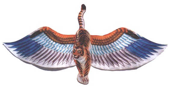 飞 虎 (FeiHu) Der fliegende Tiger Flying Tiger 124 cm x 48 cm Der Tiger ist das Symbol fuer Tapferkeit und Staerke. Er ist im Chinesischen Tierkreisszeichen das 3. Himmels-Symbol. Auch die Adler-Schwingen weisen auf die Stärke hin Weiter Variationen des Themas finden sich bei den anderen Hartfluegel-Drachen The tiger is a symbol for bravery and strehth. Within the Chinese zodiac, it represents the third house. The wings of the eagle also represent strength in Chinese mythology More variations of this topic a re to be found within the section of Hardwing Kites 老