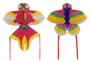 (links) Schmetterling (rechts) Goldfishes (JinYu) stand for both, wealth ('gold') and abundance ('fish') Butterflies (HuDie) represent the 'lightness of being' 金鱼(左)蝴蝶(右) 金鱼代表财富(“金”)和 丰度(“鱼”) 蝴蝶代表“存在的光明” je / each / 各个 100 cm x 9 0cm andere Drachen / other kinds of kites / 其他风筝 Copyright 2002 ff: Hans P. Boehme |