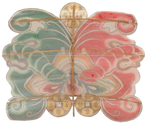 FúLì YǎnQián 'Reichtum in Sicht' Zusammenlegbarer Flachdrachen aus Bambus und Papier-Seide. Eine rote und eine gruene Fledermaus pfluecken 'Geld-Fruechte'. Fledermaeuse und Geld symbolisieren Reichtum. 'Good Fortune Before Your Eyes' Collapsible Flat Kite, made from bamboo and paper silk. A red and a green bat are both plucking 'money fruits'. Bats and money sumbolizes fortune and wealth. '福利眼前' 可折叠的板子类风筝,由竹和纸丝制成。红色和绿色的蝙 蝠都是 采摘“金钱果实”。蝙蝠和金钱丰富了财富和幸运。 51.0 x 45.5 cm (Schwanz / tail 120 cm / 尾巴) (TianJin, 1950ies / 1950年代的天津) |