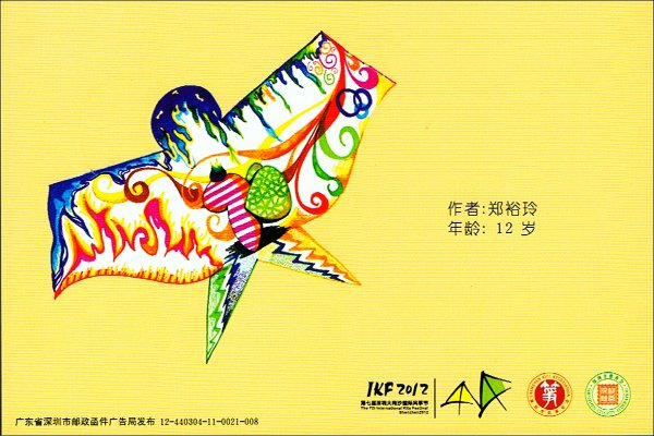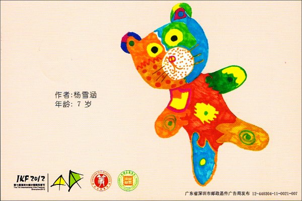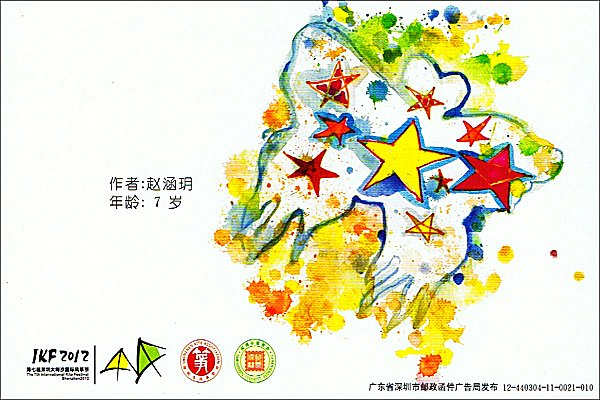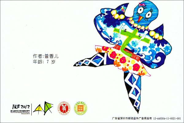 Wohlfahrtsprojekte verbunden. This picturecard set contains a series of childrens drawings of kites, following a competition. The pictures are from the winning set. The postcard is officially produced by the Chinese Postal Administration (China Post), and is an official postal statonary for the inner Chinese service (postal stationary, but without imprinted "kitestamp"). The set was available at a special postoffice on the beach of DaMeiSha, directly at the festival venue. This set has a cancellation with the festival logo and the official postal stamp. Bilder anklicken zum Vergroessern! / Click to enlarge!