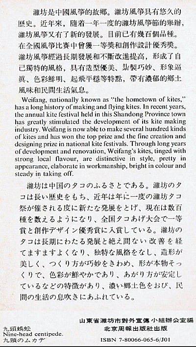 dargestellt. This picturecard set is a series 10 photographies of characteristic WeiFang kites. The set is a product of a publishing house and has the International Standard Book Number ISBN 7-80066-065-6/J01, and is therefore also listed in the kitbook section. Bilder anklicken zum Vergroessern! / Click to enlarge!