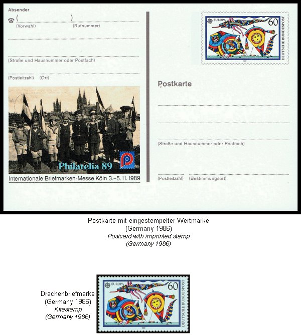 Genuine postcards are released by postal authorities and have an imprinted postal denomination or imprinted value ("postal stationary"). As a matter of course, there are postal kite cards and postpaid kite envelopes. This kind of postal stationary has an official postal character and will therefore be dealt within the kite stamp section. The descriptor "postcard" (postal stionary card with imprinted value) is sometime synonymously used for non-postal "picture postcards", but you have to apply a (postal) stamp, otherwise it will not be transported by postal authorities. All kite postcards within this section comply with this precondition. Have a look and enjoy. |