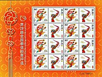 This online collection contains all available Chinese postal stamps. Genuine kite stamps must have a postal denomination (imprinted value). Tabs, tags, slips, even when perforated but without denomination, are not kite stamps, but only nice pictures with kites, named "vignettes". The perforated vignette China 2007, with the "Slender Beijing Swallow-Kite" is therfore not a kite stamp. The only genuine stamp within these joint pairs is the one with the ornamental knot, bearing the denomination (imprinted value) of 80 Fen. But it is obviously not a kite stamp. The Beijing Olympics mascot "Nini" has a "Fat Beijing Swallow-Kite" on its head. The souvenir sheet China 2007 with the Olympic mascot "Nini" contains eight vignettes, that represent different types of olympic sports, but they are not kite stamps. An additional "Nini" is to be found in the cachet of the souvenir sheet. Even with this additional "Nini" these vignettes are no valid postal prepayment, only just nice little pictures, but not kite stamps. But have a look at the 80 Fen and the 120 Fen genuine kite stamps with "Nini", and you will be surprised! Do not miss to have a look at the kite-vignette section. "Postal stationary" is a stationery item, such as a stamped envelope, letter sheet, postal card, lettercard, aerogram or wrapper, with an imprinted stamp or inscription indicating that a specific rate of postage or related service has been prepaid. They are issued by postal authorities, may directly be used to send it by mail, and therefore will be found in the kite stamp section. Stationary items without imprinted postal value may be found in the kite postcard section. "Souvenir or miniature sheets" contain postage stamps, still attached to a sheet on wich they were printed. The stamps themselves or the selvage may contain kites. If a souvenir sheet only contains a kite in the selvage, it is questionable to count it as a kite stamp. This is the case with the kite souvenir sheet Taiwan 1999, with a kite only in the selvage. Most philatelists accept these souvenir sheets as collectible postal units, because they are issued by postal authorities, even if they ar most often to big to use them on a regular letter. Nevertheless these kind of postal kite objects are to be found in the kite stamp section. Just have a look at the commemorative souvenir sheet of the 28th WeiFang International Kite Festival: it contains 16 genuine kite stamps (8o Fen Phoenix kite) , seven kite vignettes (centipede kite, butterfly, dinosaur or dragon, another butterfly kite, twin goldfish kites, an eagele kite, and another centipede kite), and a delta kite on the selvage (flown by a rabbit, as a reminder of the Year of the Rabbit). Souvenir sheets and postal stationary, as far as they are issued by postal authorities and contain kites , will be dealt within the kite stamp section.