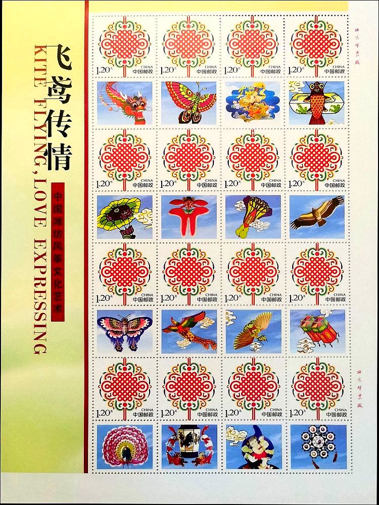 Vignettes or poster stamps are advertising labels or tags. They often have perforations, and therefore sometimes resemble postal stamps .Unlike genuine postal stamps, they don not have a postal denomination (imprinted value). Kite-Tabs, tags, slips, even when perforated but without denomination, are not kite stamps, but only nice pictures with kites. An interesting example of a vignette in official use as a (faked) postage, is the commemorative vignette for the 28th International Stamp Exhibitionon, on behalf of the 28th International Kite Festival in WeiFang. Sometimes you will find genuine postal stamps as joint pairs together with vignettes. The perforated vignette China 2007, with the "Slender Beijing Swallow-Kite" is therfore not a kite stamp but a kite vignette, without postal value. The only genuine stamp within these joint pairs is the one with the ornamental knot, bearing the denomination (imprinted value) of 80 Fen. The Beijing Olympics mascot "Nini" has "Fat Beijing Swallow-Kite" on its head. The souvenir sheet China 2007 with the Olympic mascot "Nini" contains eight vignettes that represent different types of olympic sports, but they are not kite stamps but vignettes. An additional "Nini" is to be found in the cachet of the souvenir sheet. Even with this additional "Nini" these vignettes are no valid postal prepayments, only just nice little pictures, but no kite stamps. But have a look at the 80 Fen and the 120 Fen genuine kite stamps with "Nini" , you will be surprised! Souvenir or miniature sheets contain postage stamps, still attached to a sheet on wich they were printed. The stamps themselves or the selvage may contain kites. Most philatelists accept souvenir sheets as collectible postal units. Just have a look at the commemorative souvenir sheet of the 28th WeiFang International Kite Festival: it contains 16 genuine kite stemps (8o Fen Phoenix kite) , seven kite vignettes (centipede kite, butterfly, dinosaur or dragon, another butterfly kite, twin goldfish kites, an eagele kite, and another centipede kite), and a delta kite on the selvage (flown by a rabbit, as a reminder of the Year of the Rabbit). Souvenir sheets and postal stationary , as far as they are issued by postal authorities and contain kites, will be dealt with in the kite-stamp section.