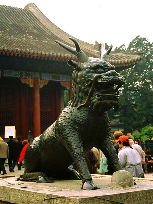 The QiLin is a Chinese mythical creature. In addition to the dragon (Long), the Phenix (FengHuang) and Turtle (Gui) the QiLin is one of the "Four Magical Animals". A very elaborate QiLin is to be seen in the BeiJing Summer Palace.