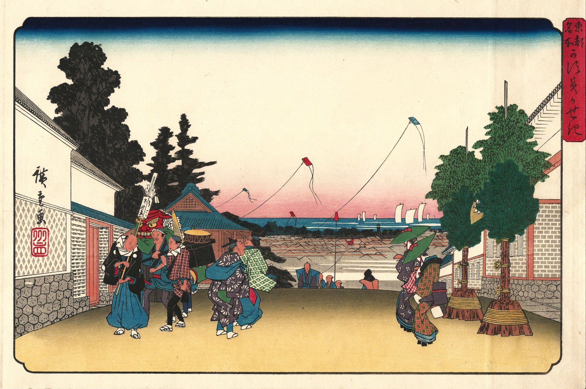 kites ("Edo-tako", "江戸凧") fly overhead. Musicians