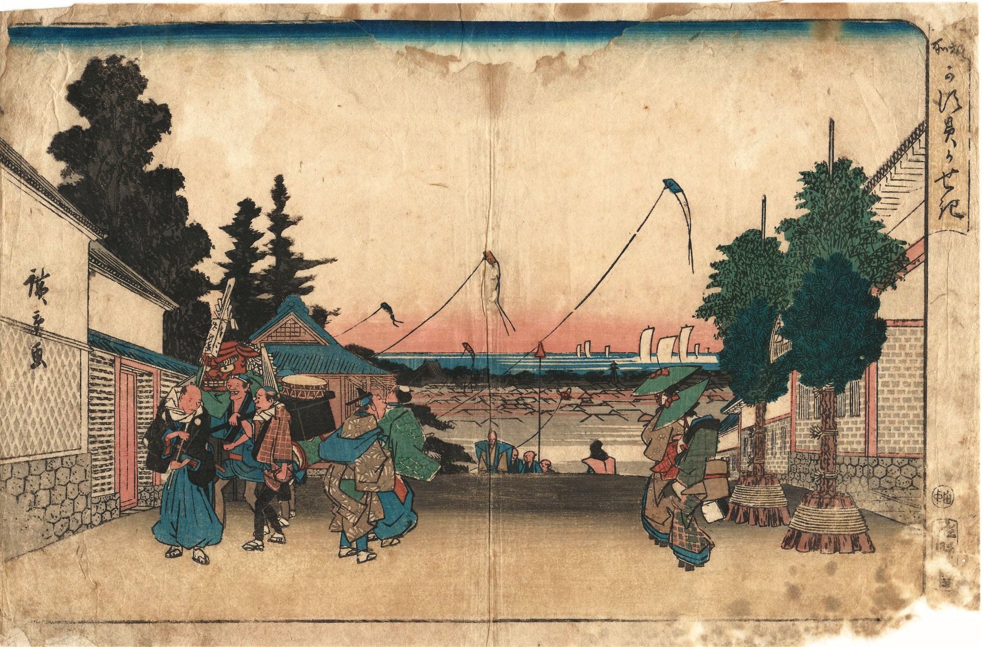 Kasumigaseki-zaka'), on New Year's Day. The rooftops of Edo